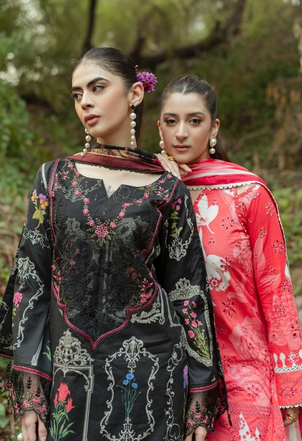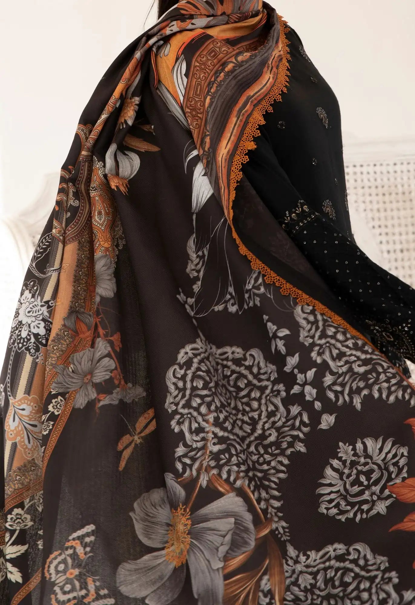 Unveil your charm with our intricately embroidered suit, a perfect blend of tradition and contemporary design. The deep black base adorned with vibrant floral patterns reflects pure sophistication, crafted for women who carry grace in every moment. From delicate detailing to luxurious fabric, every inch of this attire tells a story of elegance, confidence, and individuality.