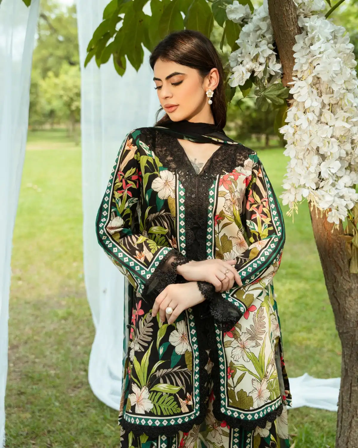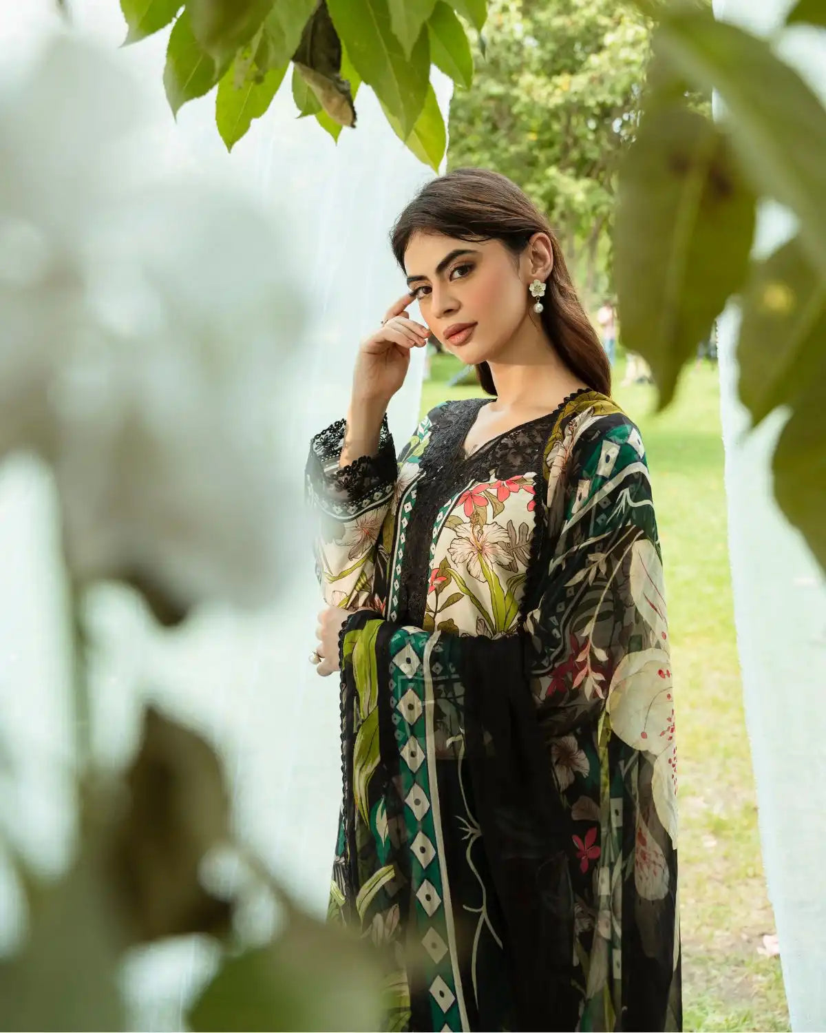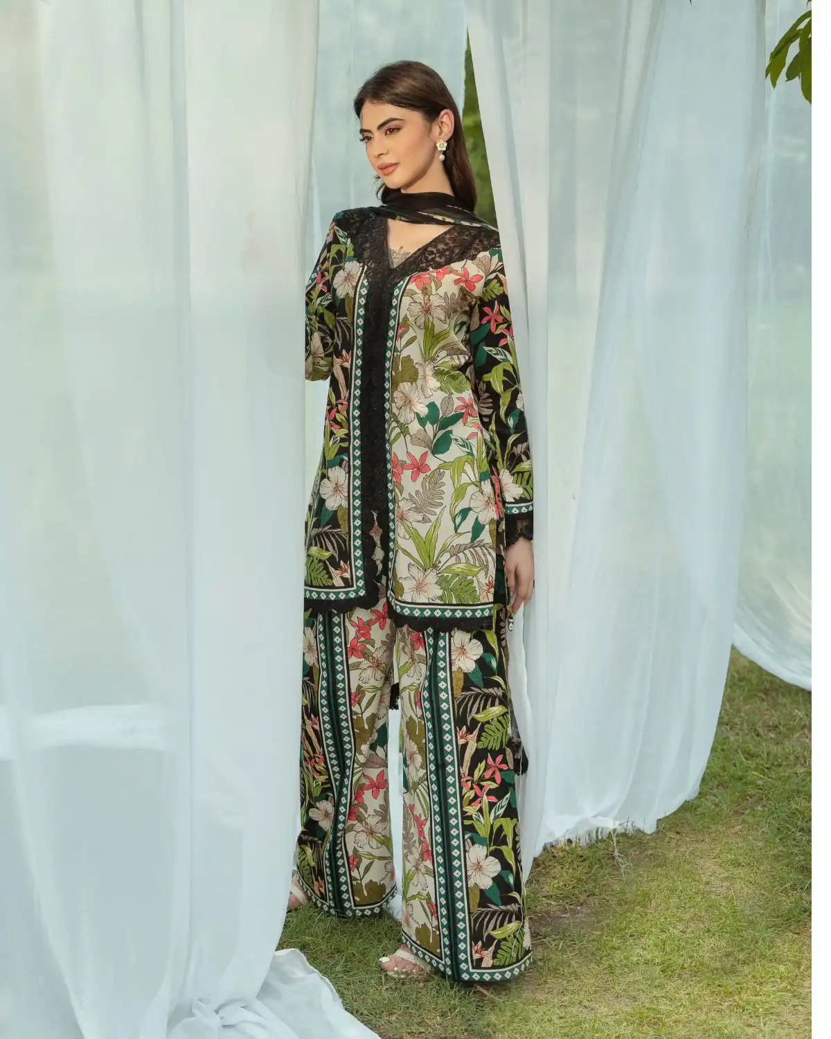 Set on an elegant black ivory base, this tropical-inspired outfit features vibrant hibiscus and leafy prints in red, pink, white, and green. Intricate embroidery and paneling accent the neckline and sleeves, while a sheer chiffon dupatta adds flow. Paired with flared palazzo trousers in a matching print, the look is fresh, exotic, and fashion-forward.