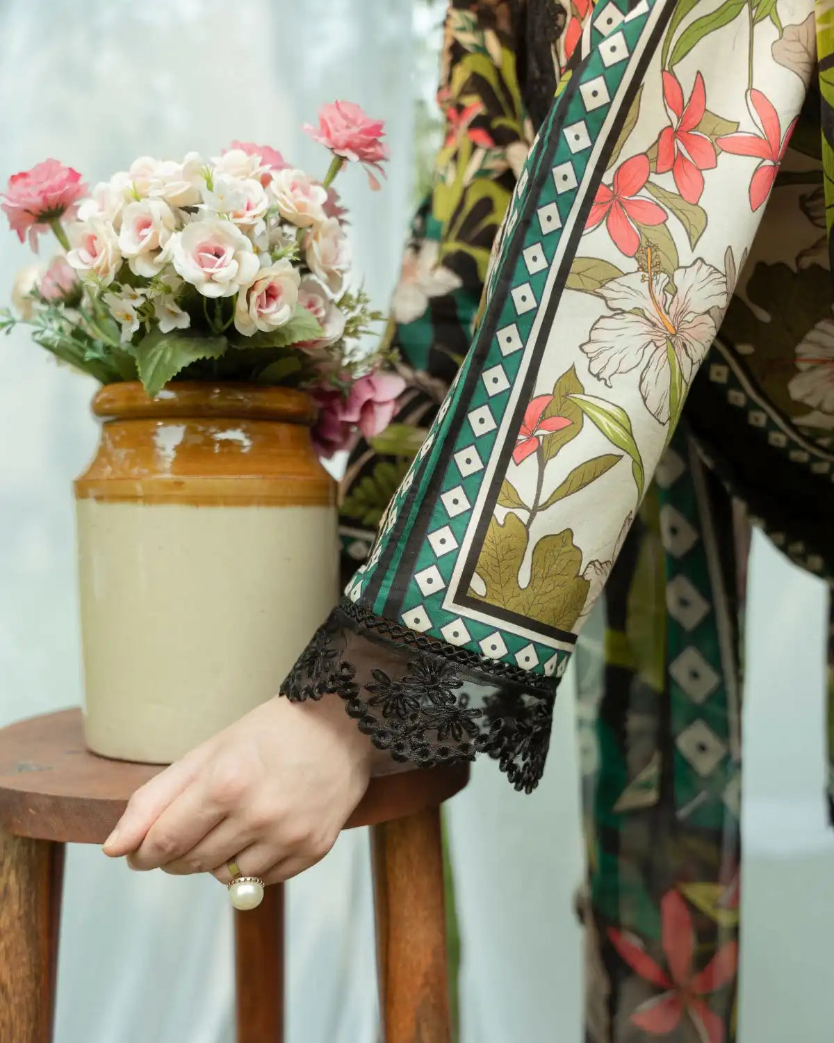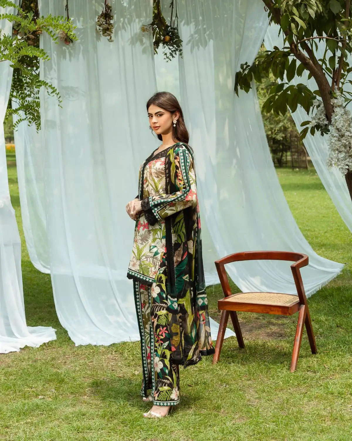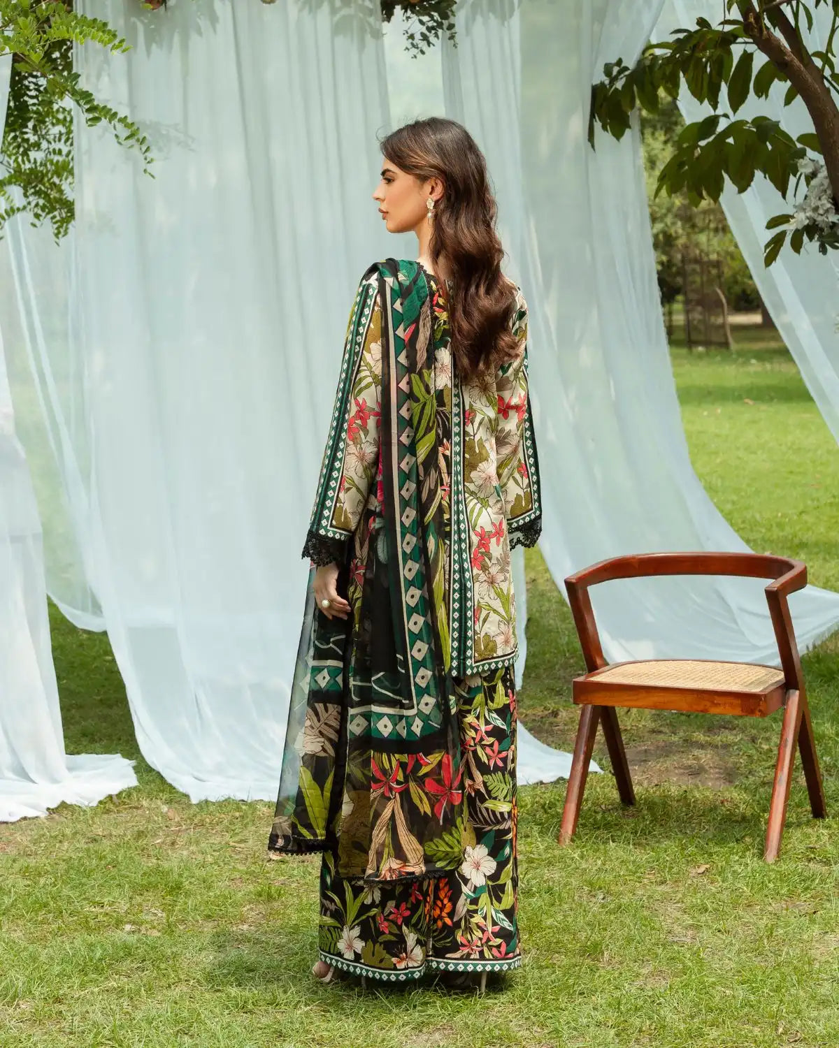 Set on an elegant black ivory base, this tropical-inspired outfit features vibrant hibiscus and leafy prints in red, pink, white, and green. Intricate embroidery and paneling accent the neckline and sleeves, while a sheer chiffon dupatta adds flow. Paired with flared palazzo trousers in a matching print, the look is fresh, exotic, and fashion-forward.