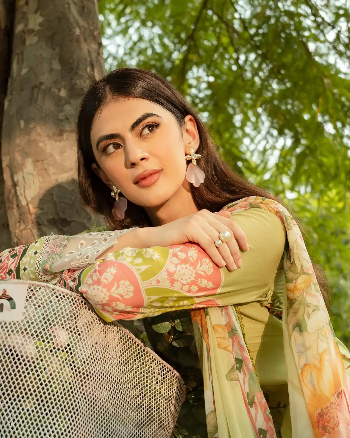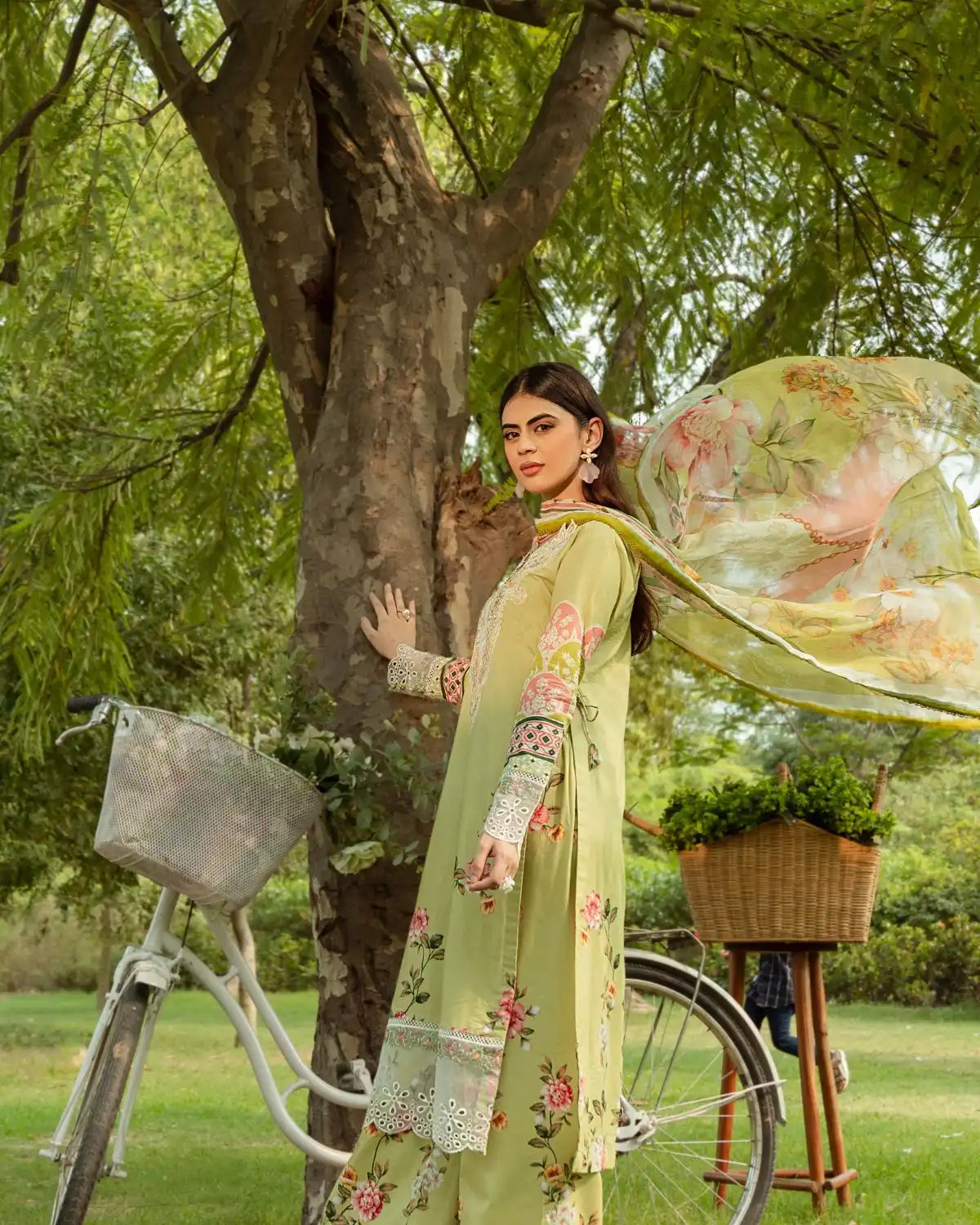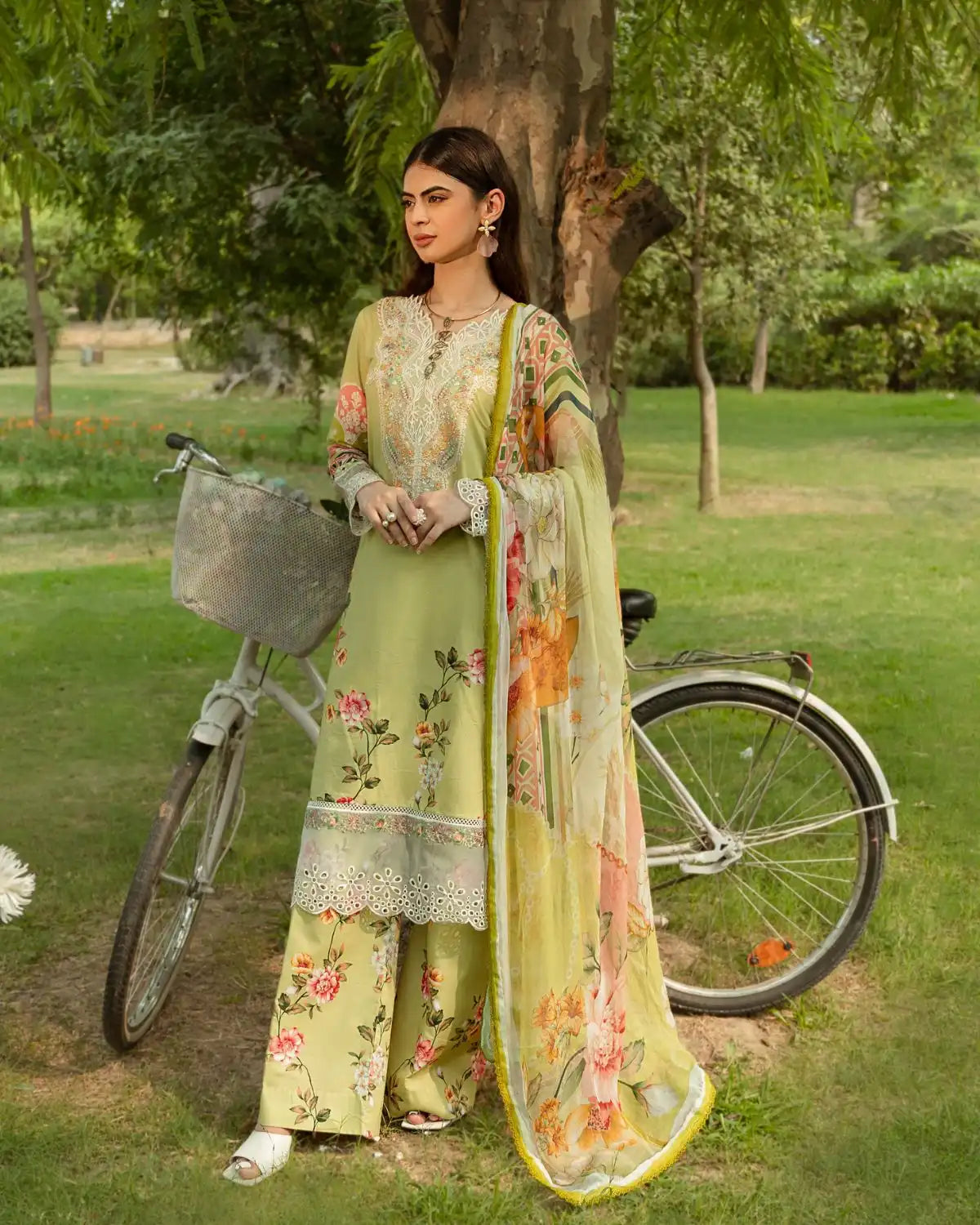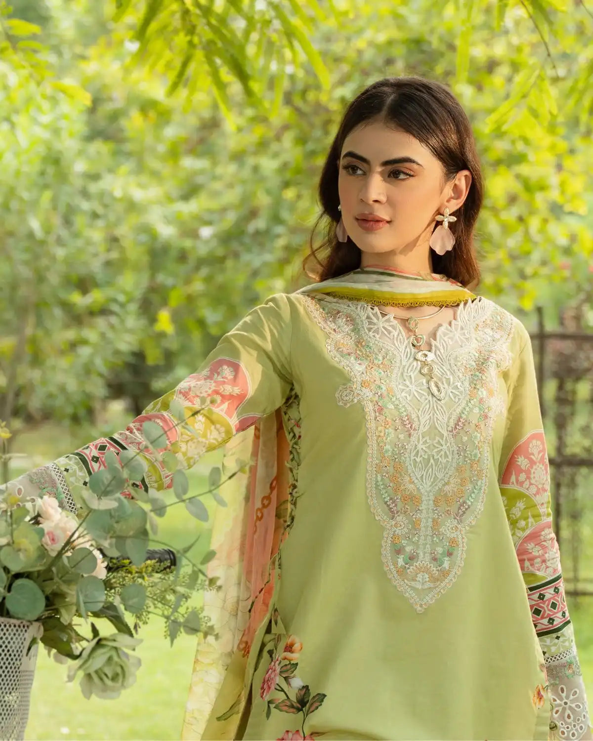 The Camellia Dress features a light green base with intricate embroidery and floral patterns. White patch detailing on the neckline and cuffs adds elegance, while long sleeves and wide-leg pants offer a graceful silhouette. Paired with a matching printed dupatta, this lawn and silk outfit is perfect for warm-weather sophistication.