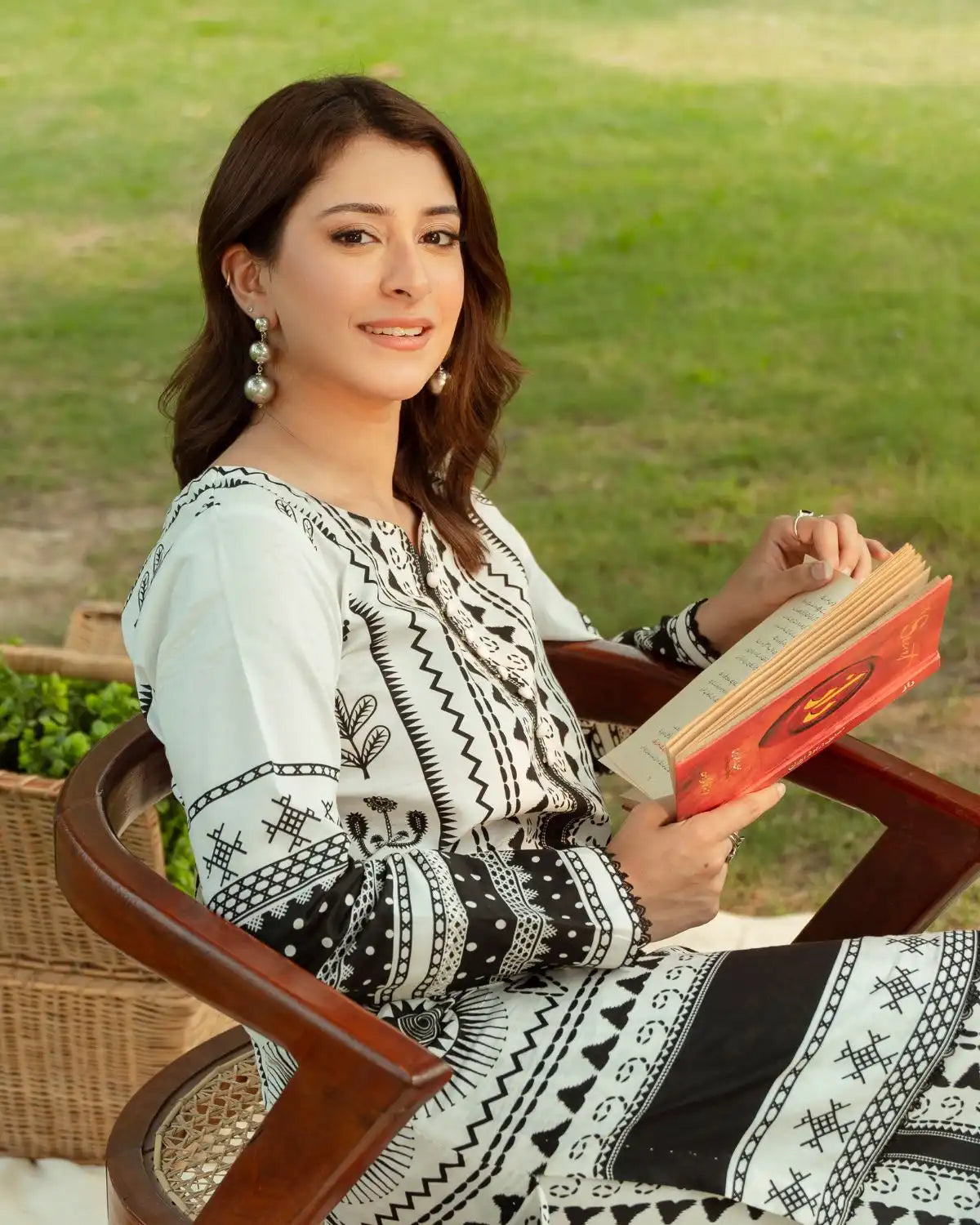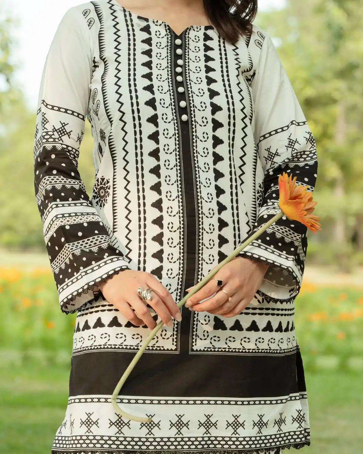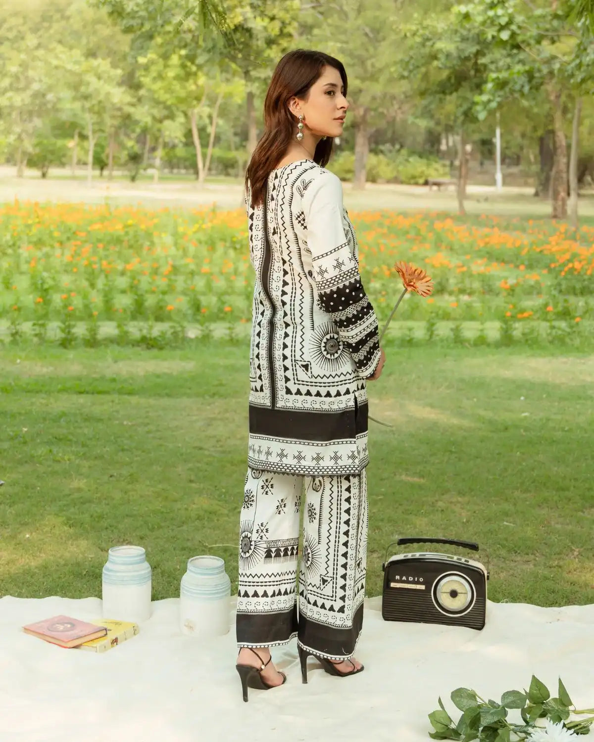 A timeless monochrome co-ord set in breathable lawn, this outfit blends black and white in bold symmetry. Detailed with lace and buttons along the neckline, it captures contrast, balance, and individuality—an elegant statement in pure form and minimalism.