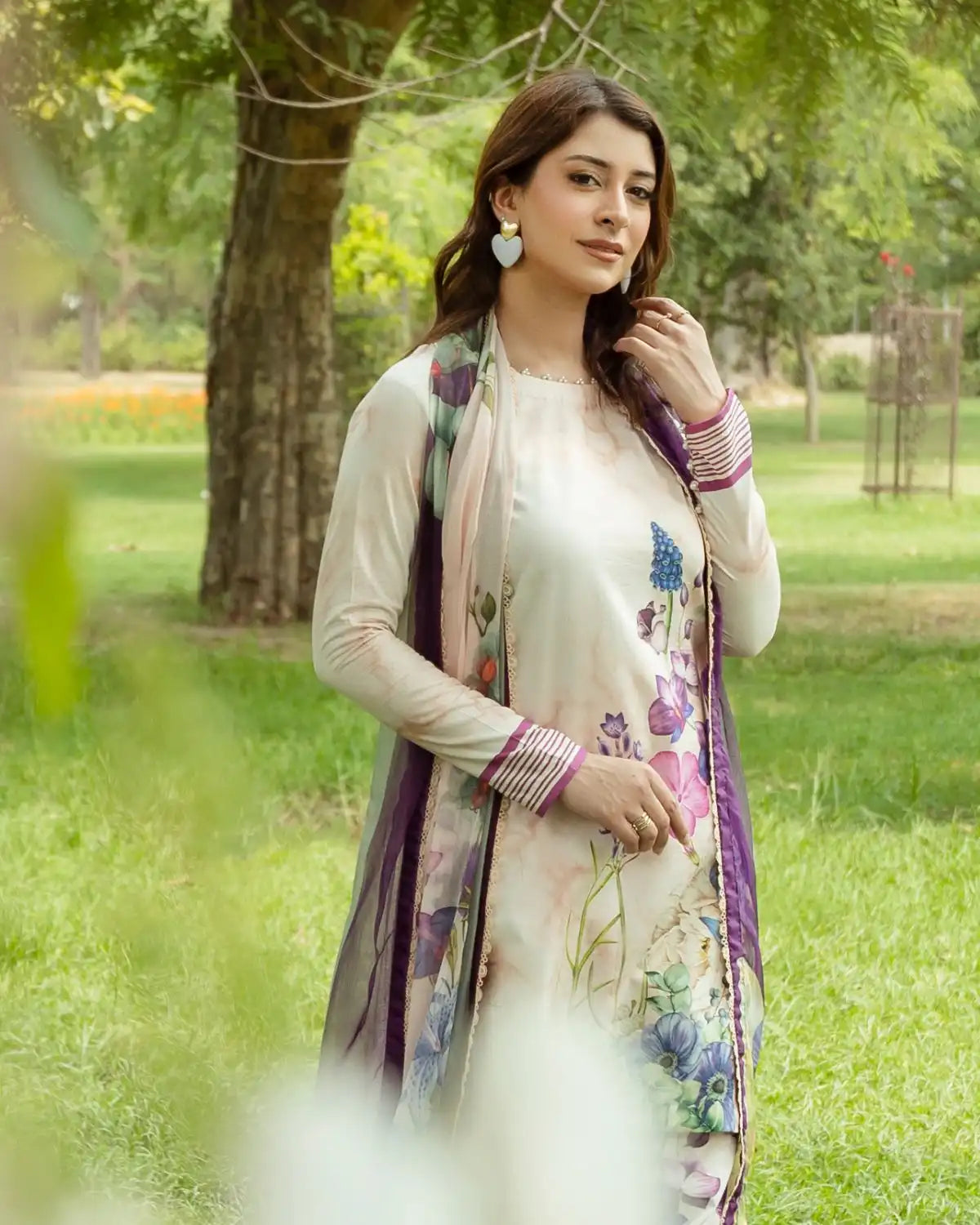 The Freesia Summer Dress is light, cheerful, and full of charm. Crafted from breezy lawn and silk in soft buttery purple, fawn white, and pastel blue, it features a playful silhouette with fitted sleeves and a pearl-detailed boat neckline inspired by freesia blooms. Perfect for sunny mornings and joyful outings.