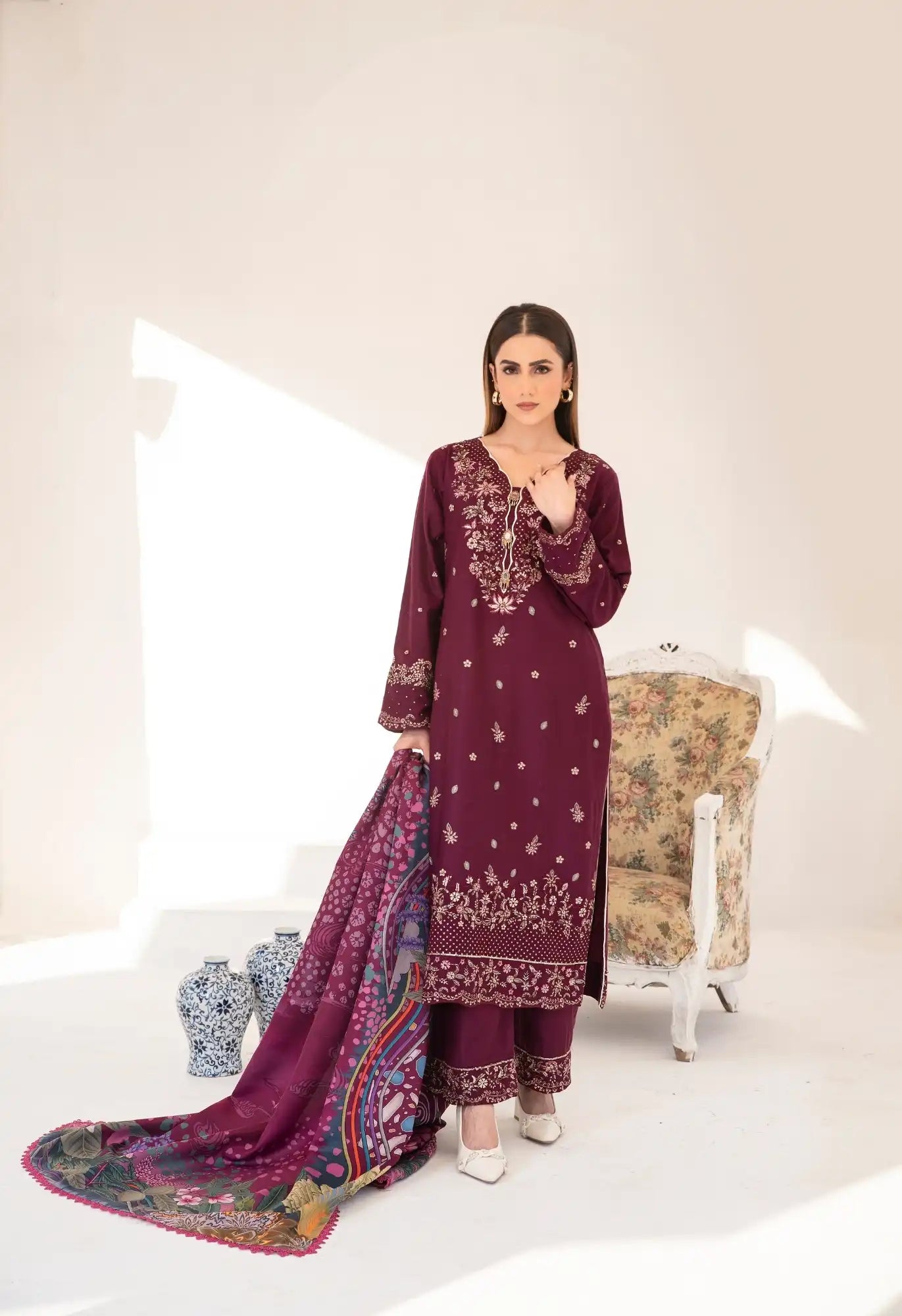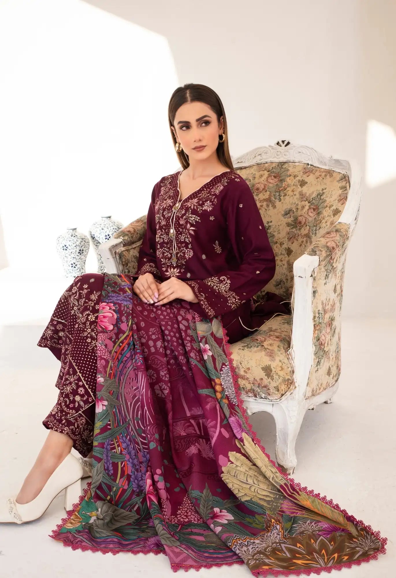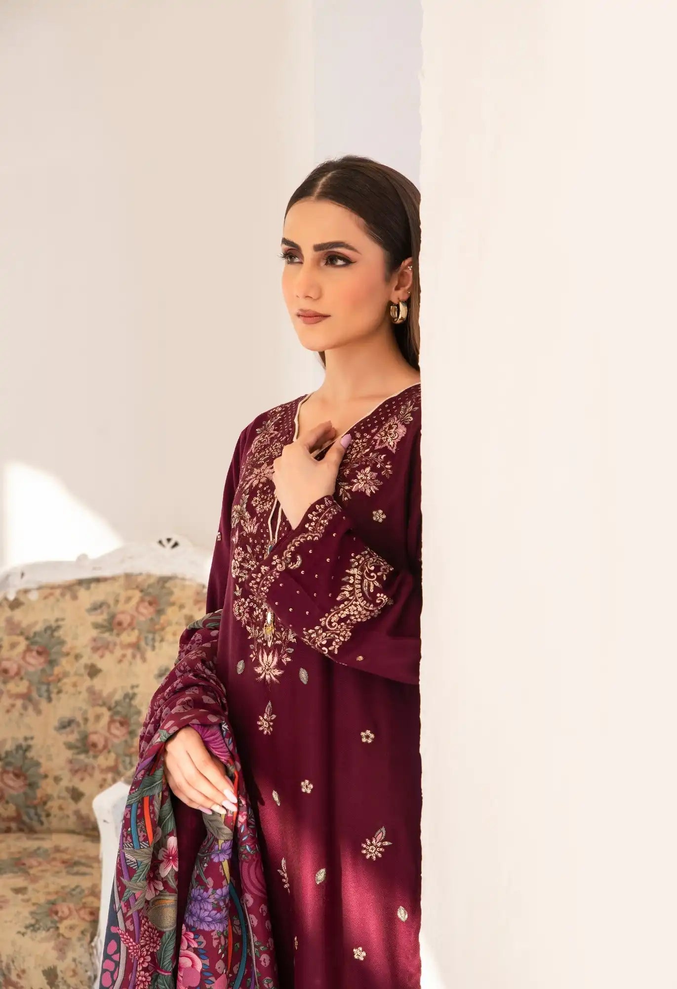 This fusion of floria embroidery in petal pink, pistachio green, rose gold tilla with a touch of gold sequence on warm woolen canvas, finished with composed border along with lightly finished sleeves and cullot with a scallop border. It comes with a digital printed floral twill shawl, finished with four sided lace.