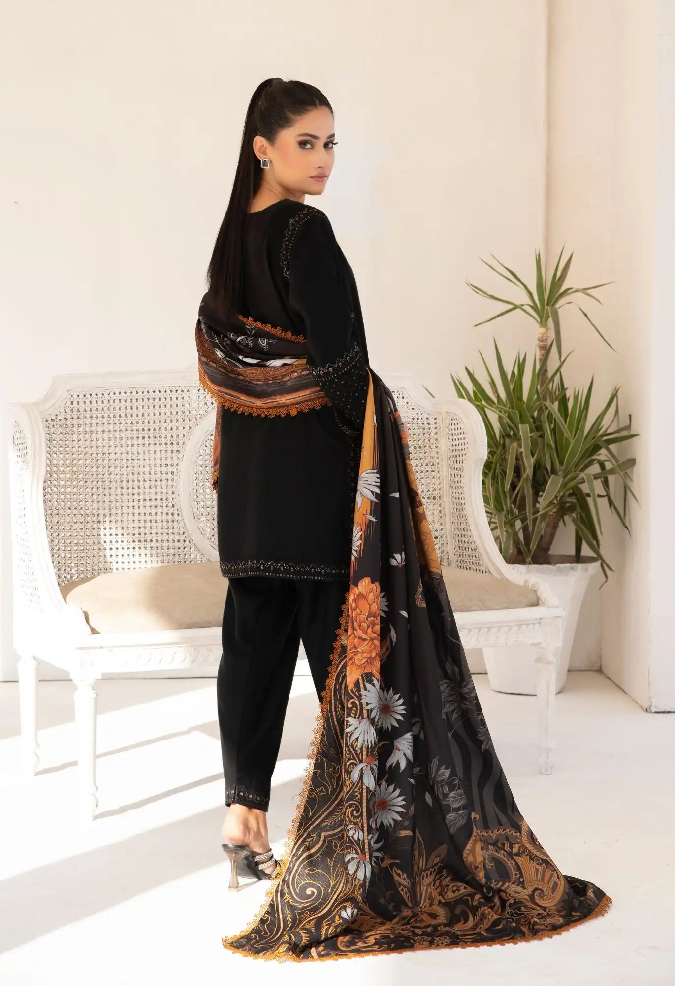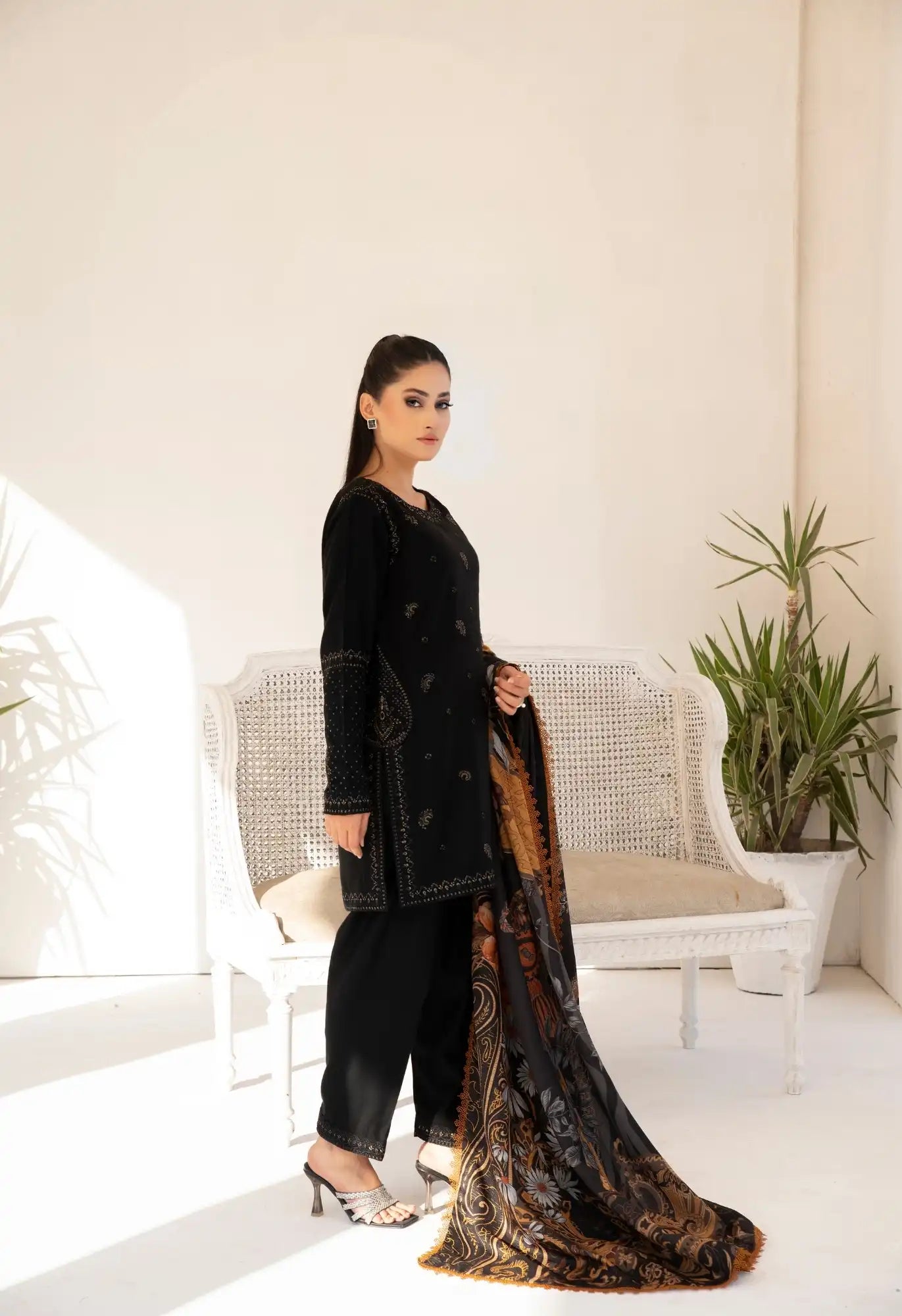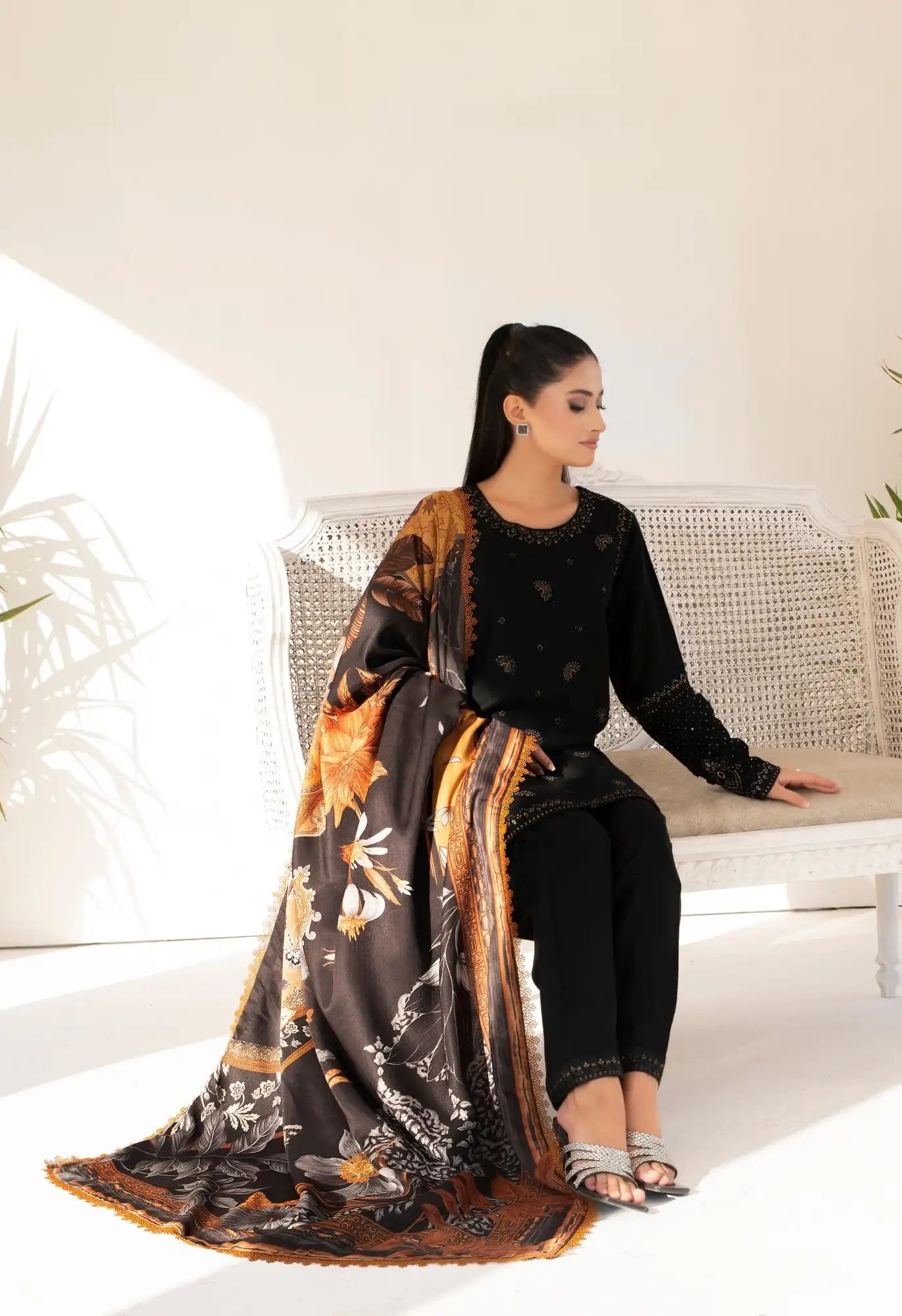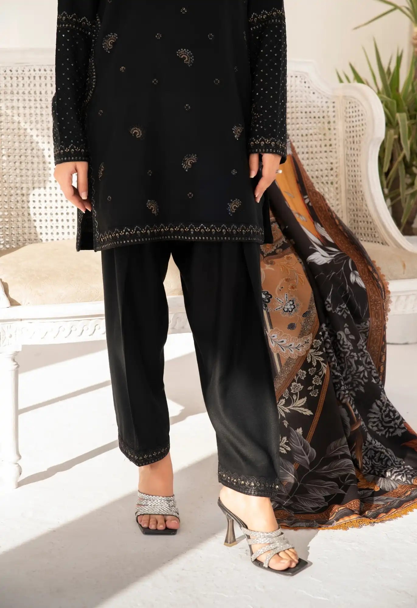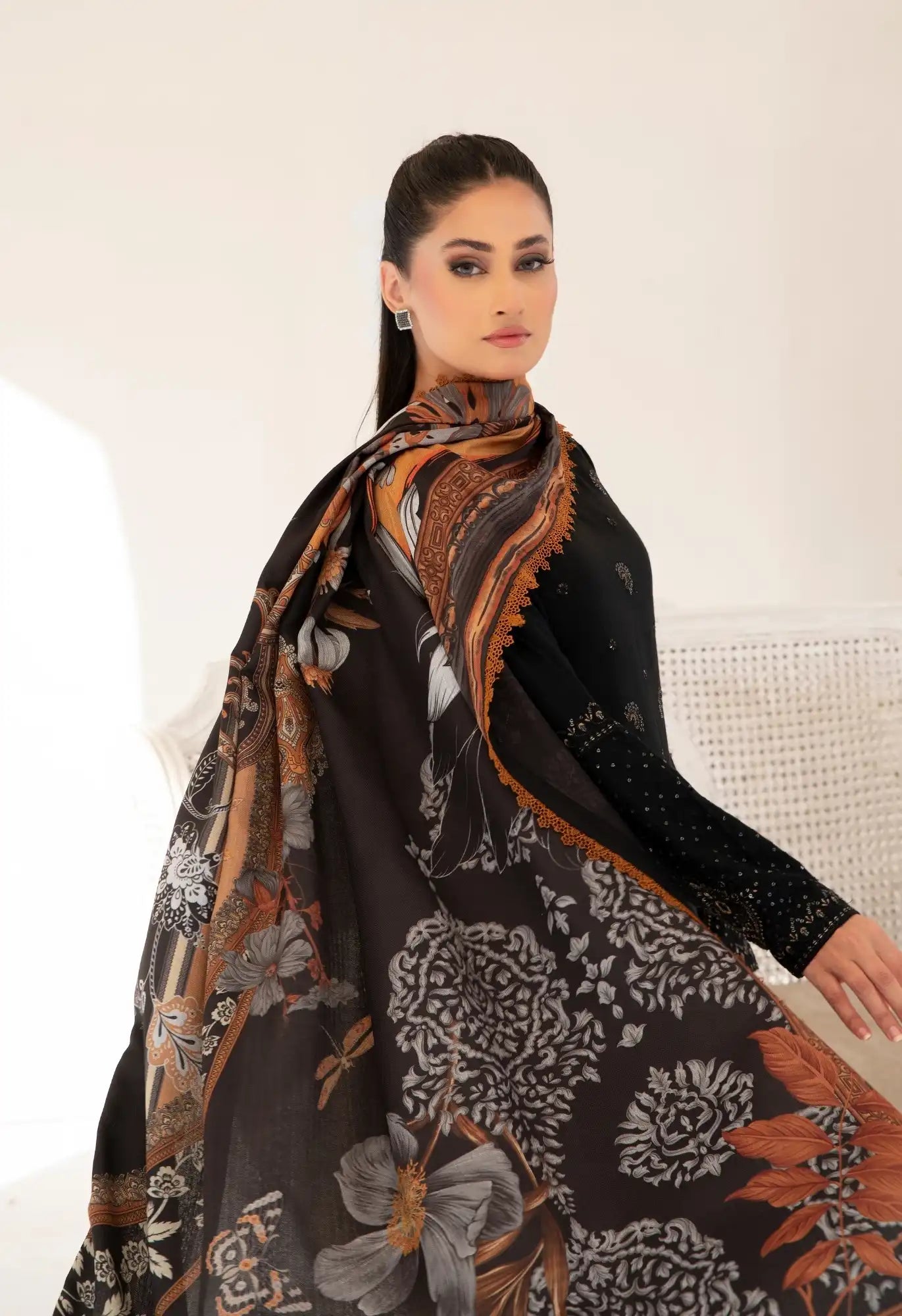A symphony of blossoms and delicate leaves create a rich neckline on a canvas of warm twill fabric. Intricate tanka embroidery comes to life in hanami: shades of red, teal, gold tilla with a touch of sequence. Along with heavily composed sleeves, shirt finished with floral borders. Composed digital prints, garden depicted on the canvas of twill shawl finished with four sided lace on borders.