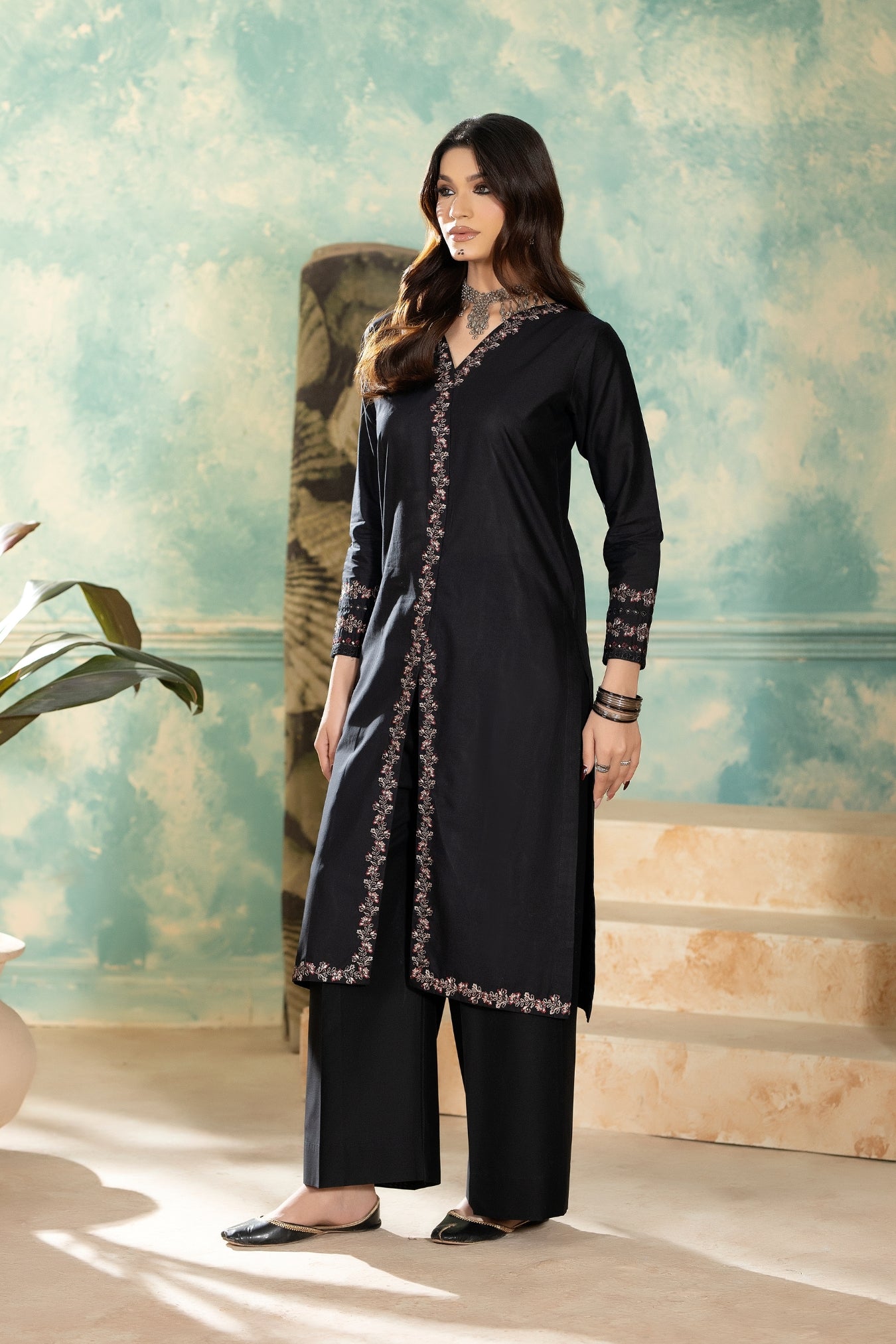 Laaib is a refined black two-piece ensemble designed with an elegant, modest silhouette. The outfit carries soft embroidered accents in warm tones that add gentle festivity while preserving a composed and versatile look suitable for both day and evening wear.