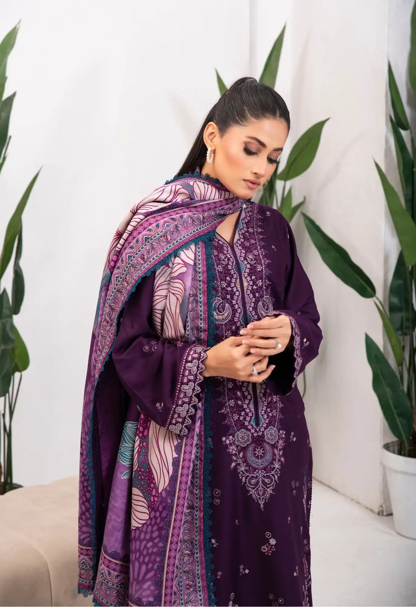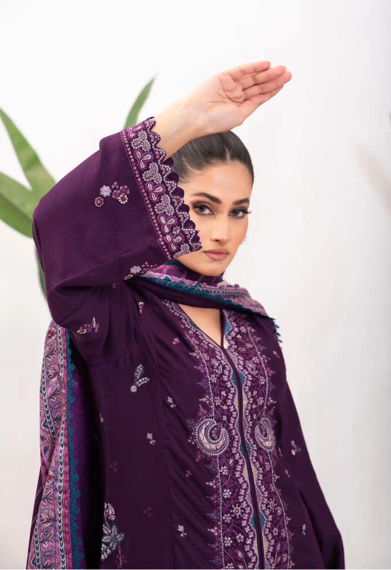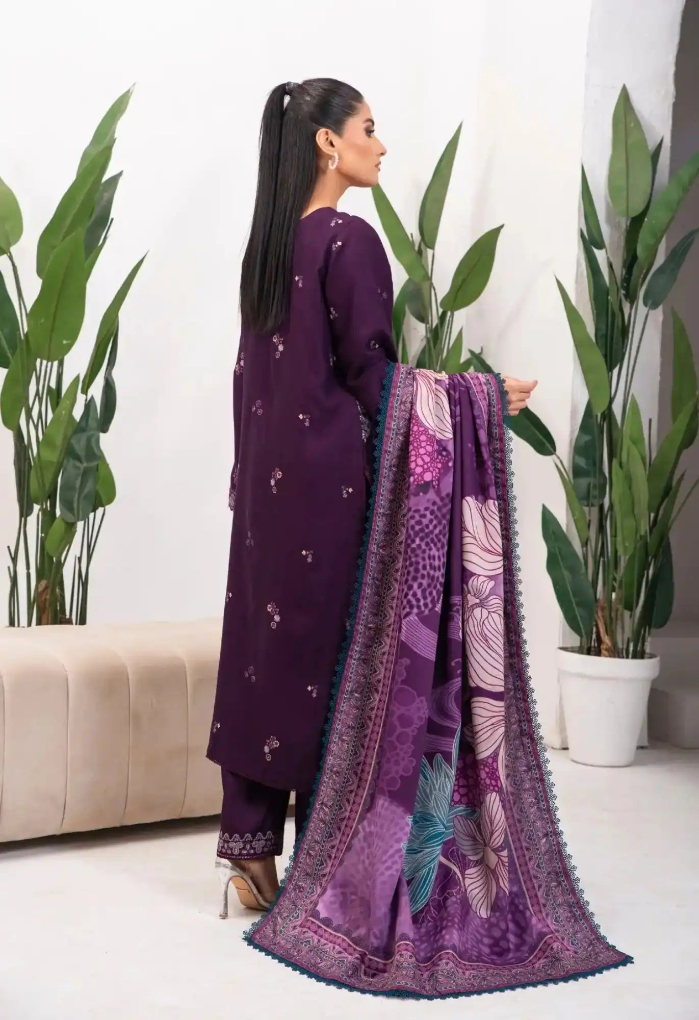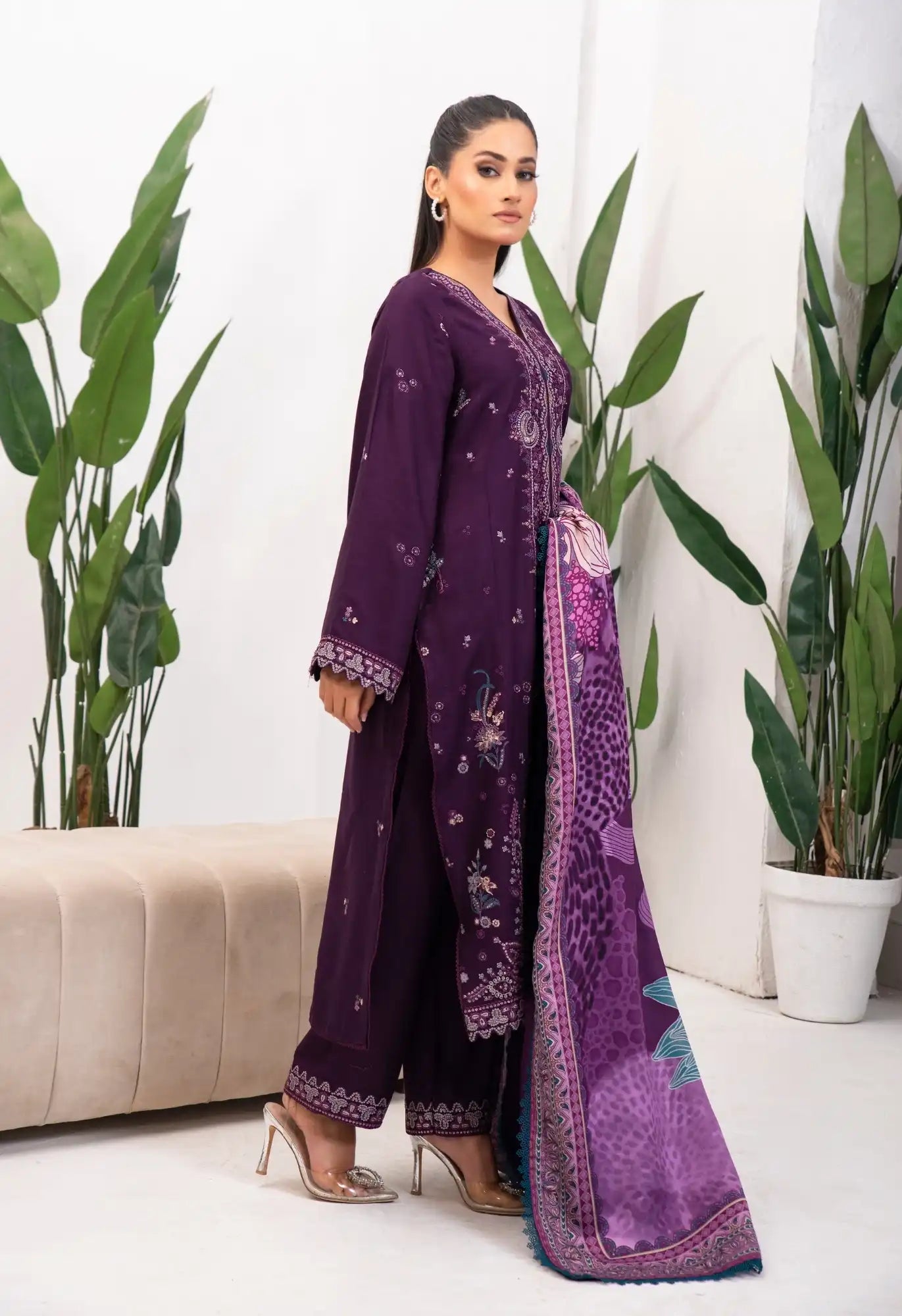 Camile's purple hue is elegantly crafted with lilies themed embroidery, harmonious blend of lilacs, pinks, greys and zinc. With a touch of gold tilla and sequence on the warm twill, finished with scallop borders on the sleeve and cullot. The pattern of lotus leaves is depicted on the canvas of the shawl, heavily composed digital printed borders making this piece a regal choice.