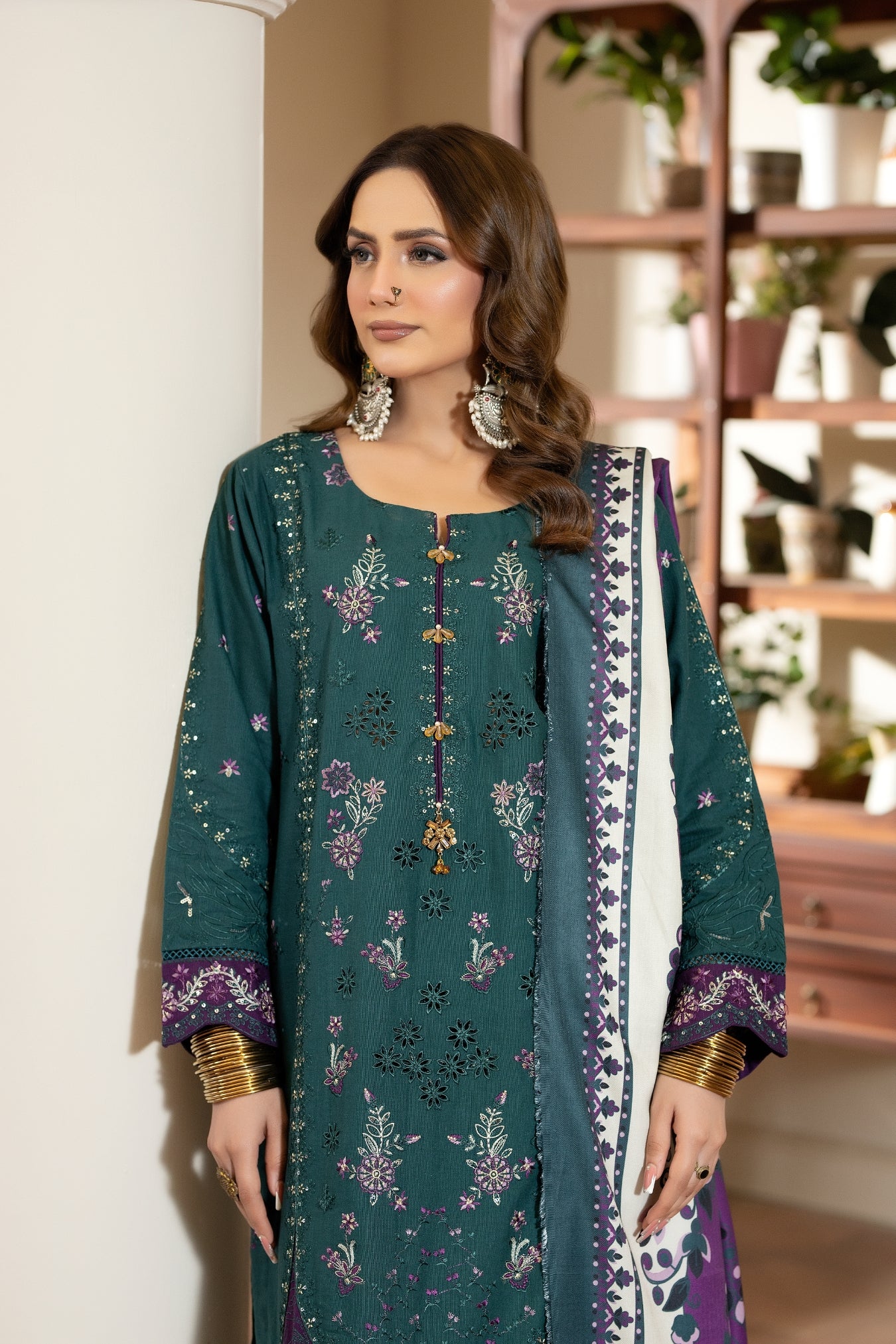 Laila is a three-piece winter ensemble crafted from soft, warm khaddar, designed to offer comfort with a refined sense of style. The deep teal shirt features a long, straight silhouette with full sleeves, adorned with delicate floral and paisley-inspired prints in purple, white, and subtle gold. The neckline is thoughtfully detailed, adding an elegant touch to the overall design.