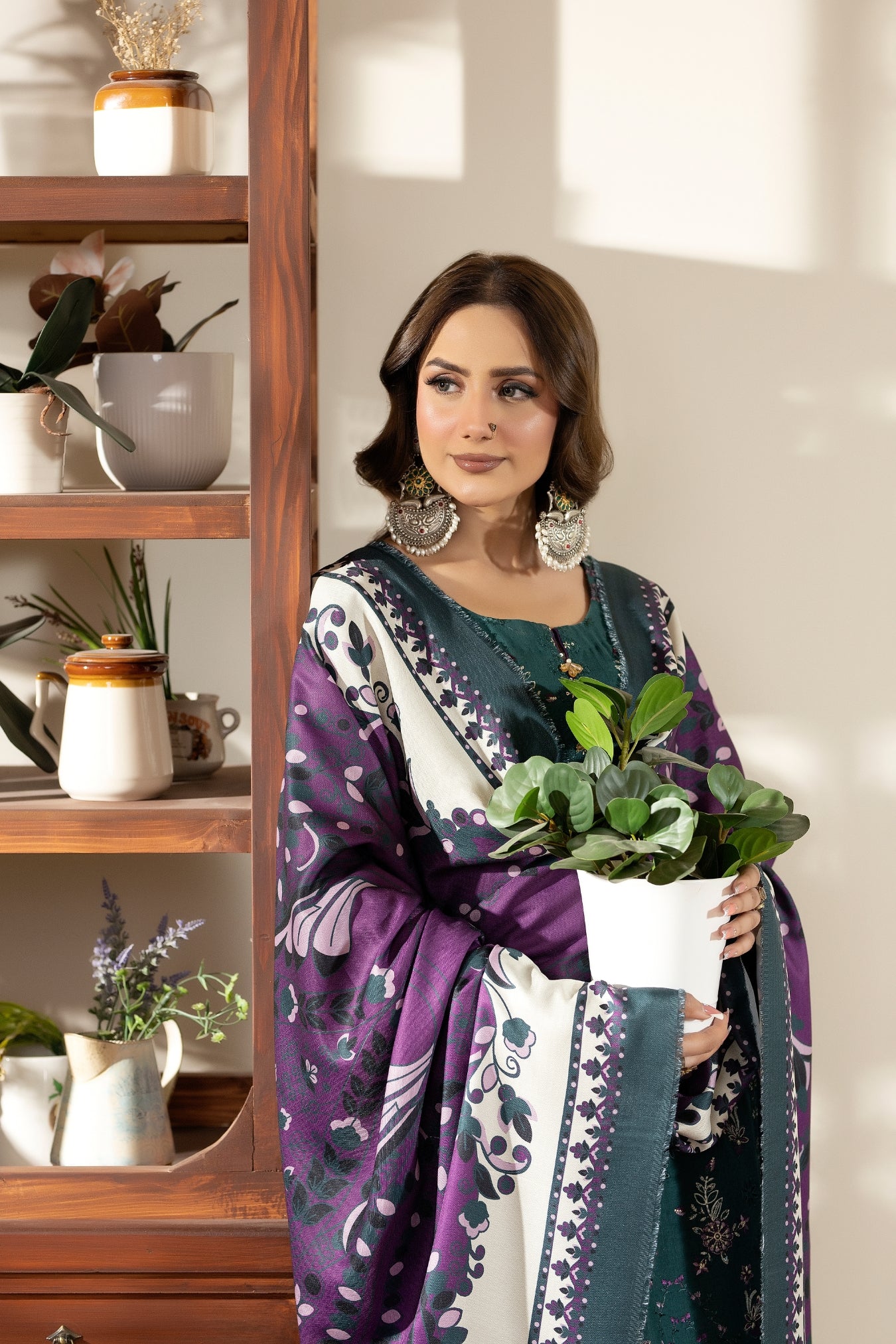Paired with a beautifully printed shawl and coordinating trousers, Laila brings together graceful patterns and seasonal warmth, making it an ideal choice for everyday sophistication throughout the winter season.