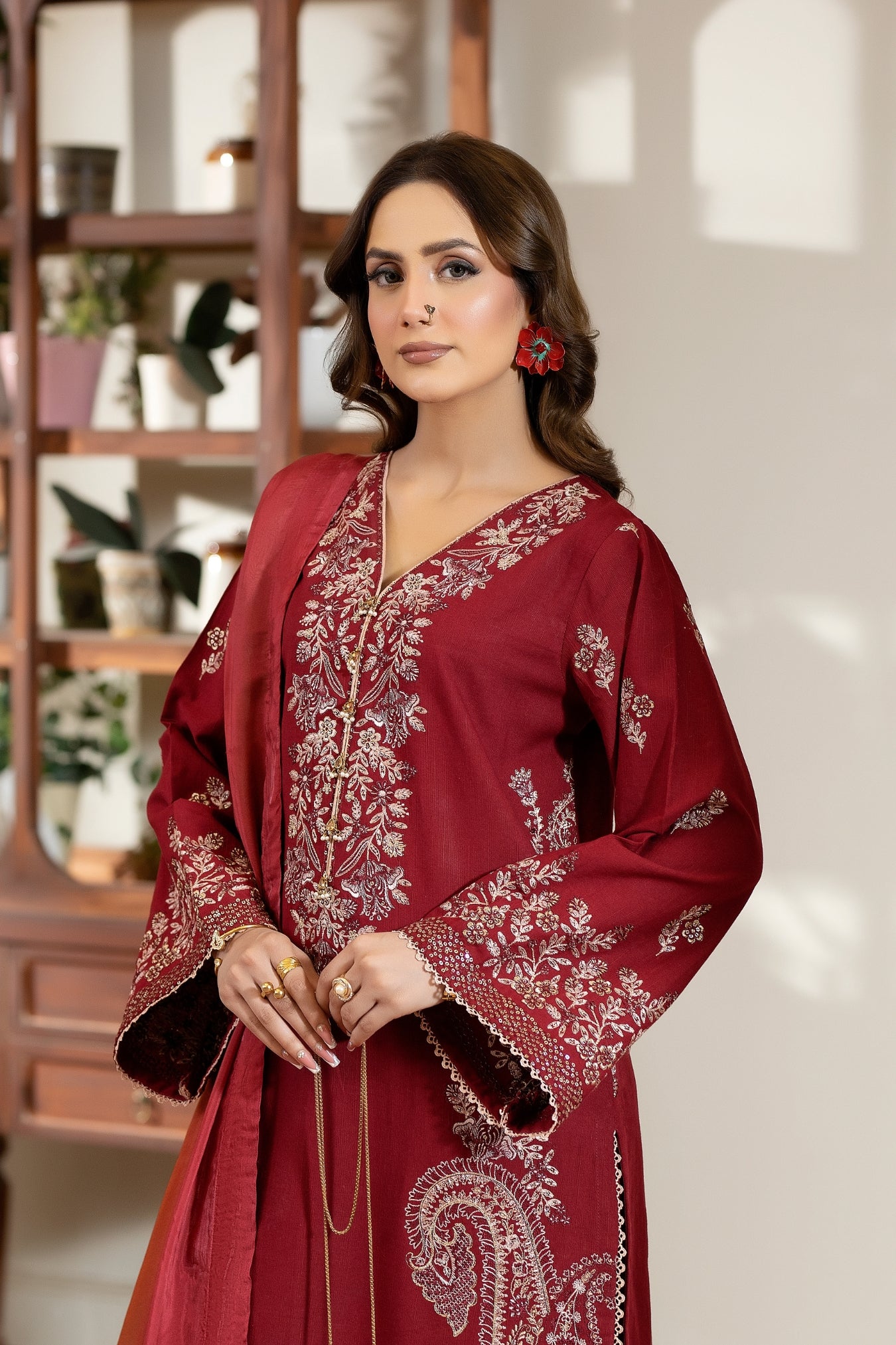 Lalsaa is an elegant three-piece ensemble crafted in a deep maroon tone, offering a refined blend of richness and seasonal warmth. The long, straight-cut kurta features a modest V-neckline and is detailed with intricate, symmetrical embroidery in soft gold and off-white. Delicate motifs enhance the sleeves, while an ornate embroidered pattern along the lower sides adds a graceful finishing touch.