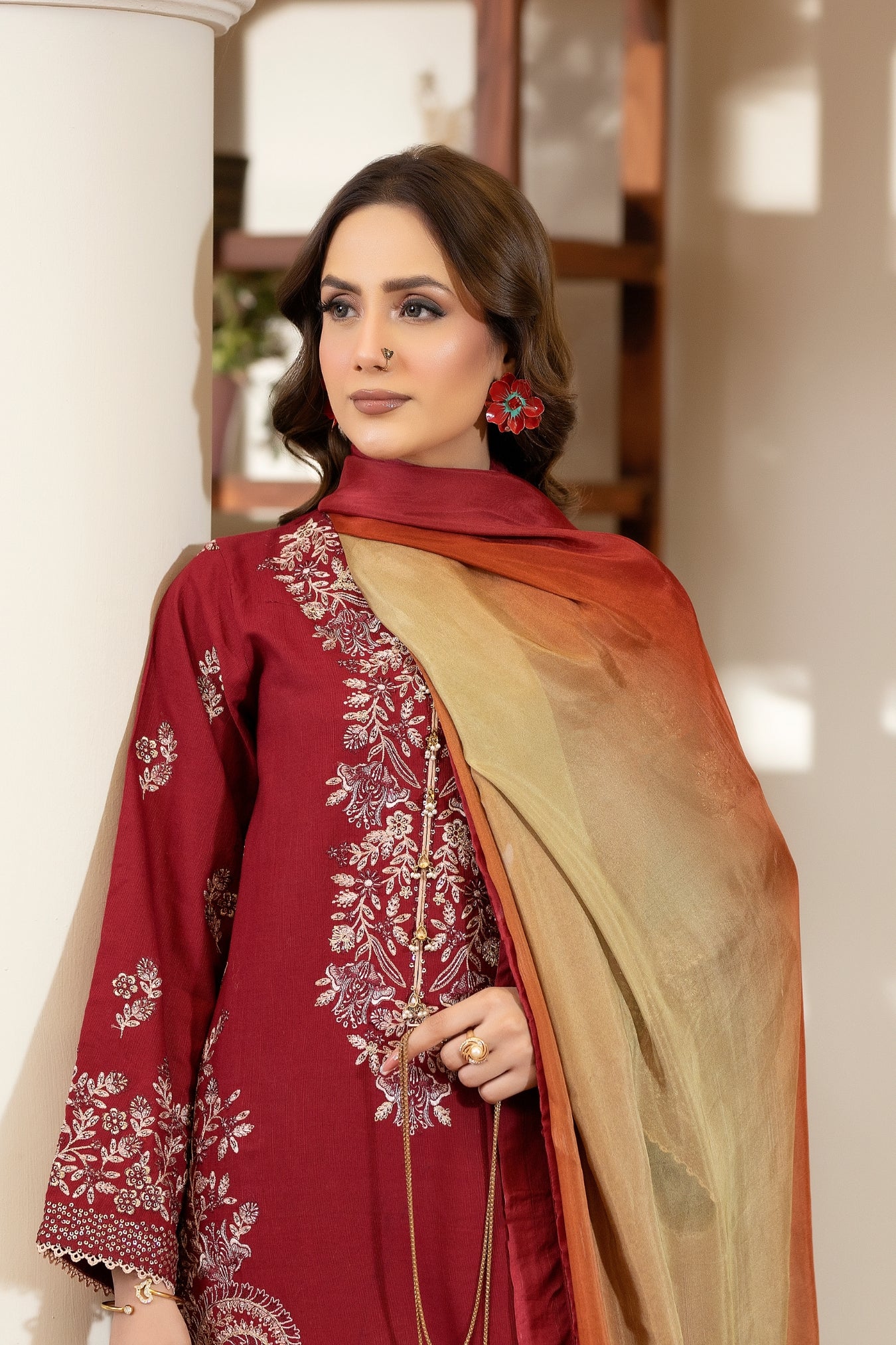 The dupatta is crafted from a soft, flowy raw silk blend featuring a gentle gradient — transitioning from maroon into warm earthy tones. Its subtle finish complements the ensemble beautifully and adds an elegant sense of movement.