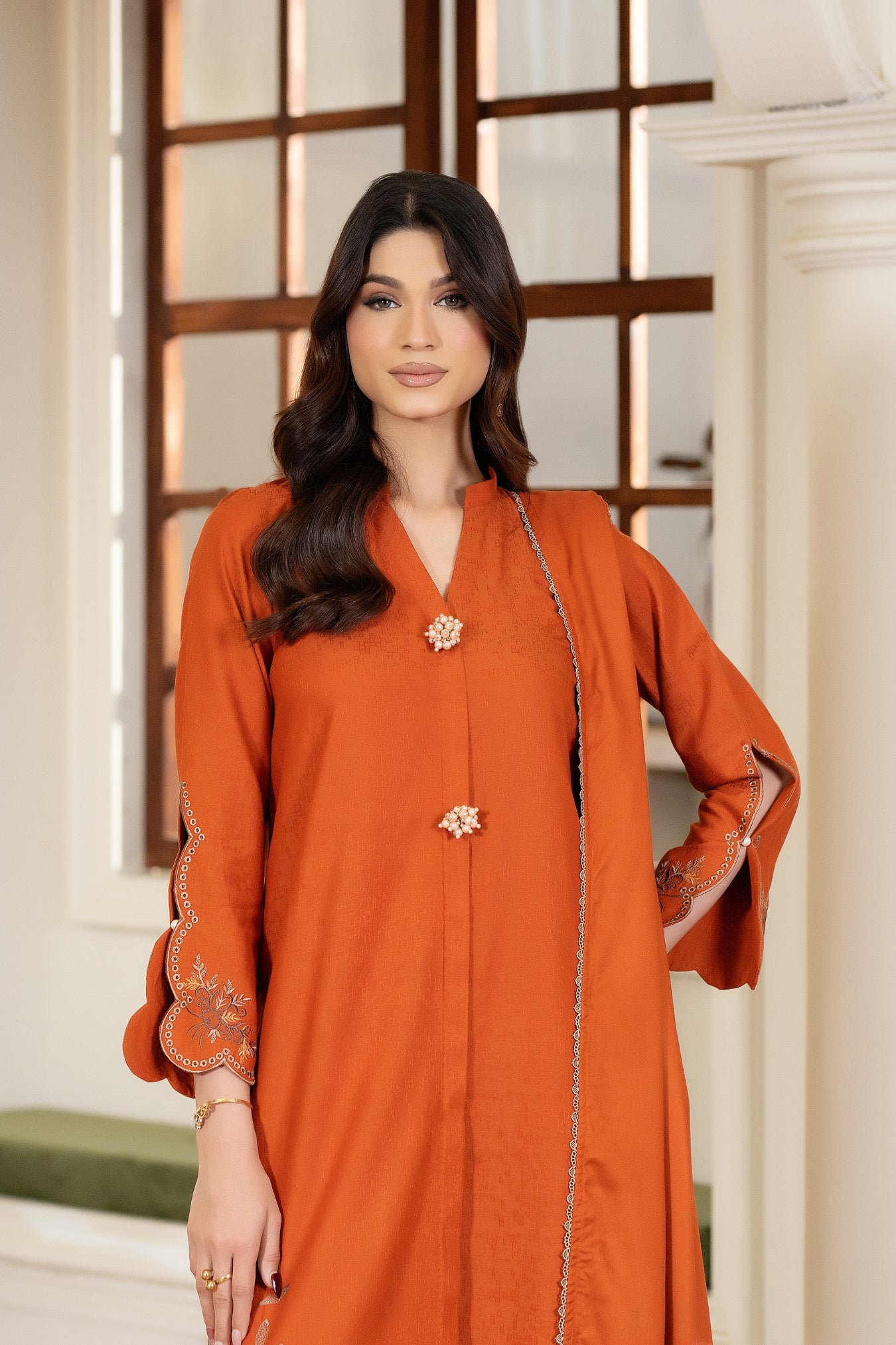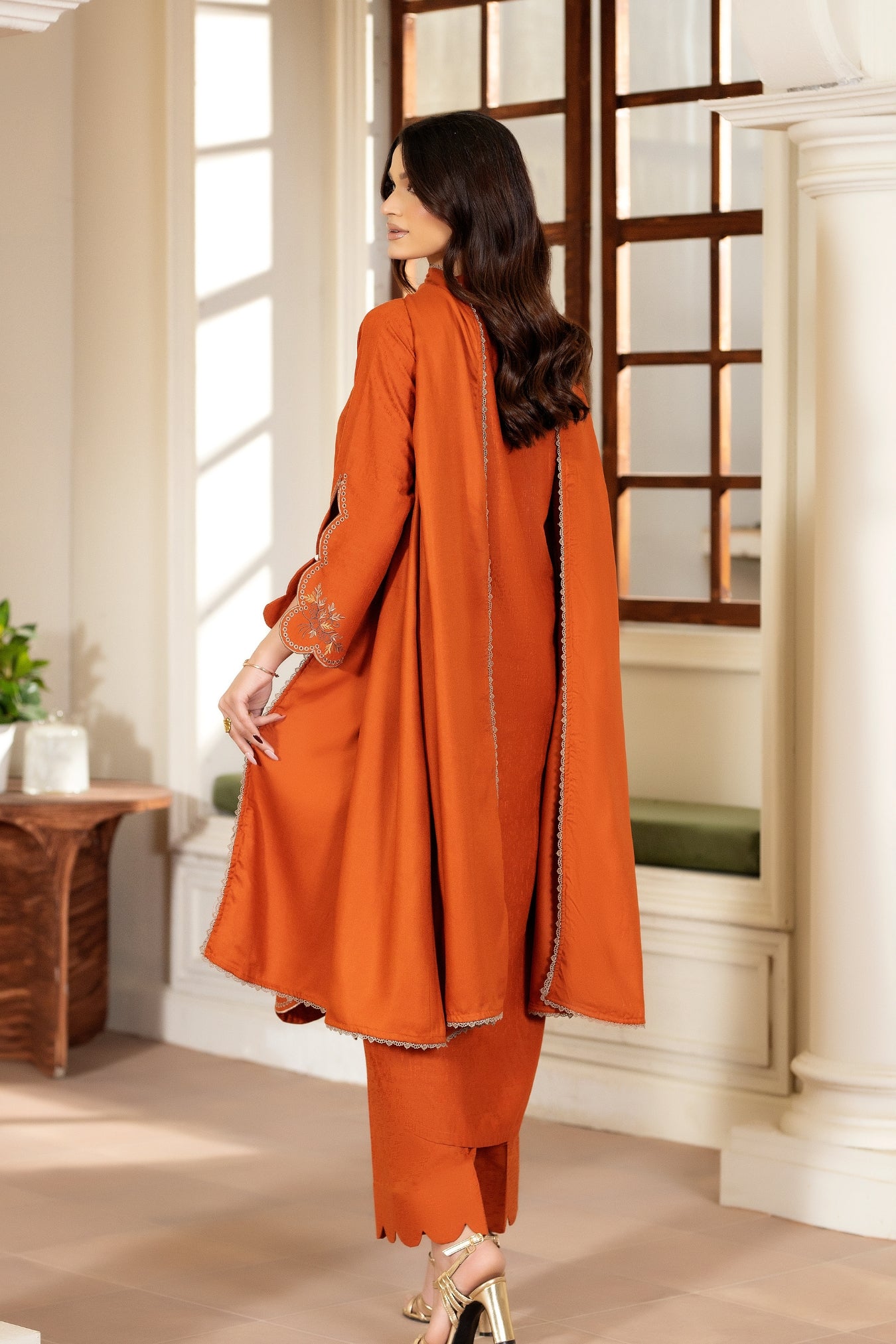 Kastor is a graceful three-piece stitched ensemble designed in a warm burnt-orange tone, offering a rich and elegant aesthetic. The shirt is crafted from soft, light jacquard, giving the outfit a refined drape ideal for semi-formal occasions. Its long kurta silhouette features a clean 12-inch front cutline, accented with delicate floral embroidery near the hem and on the scalloped sleeves. Two subtle decorative buttons enhance the neckline, while the scalloped hem adds a feminine and polished finish.