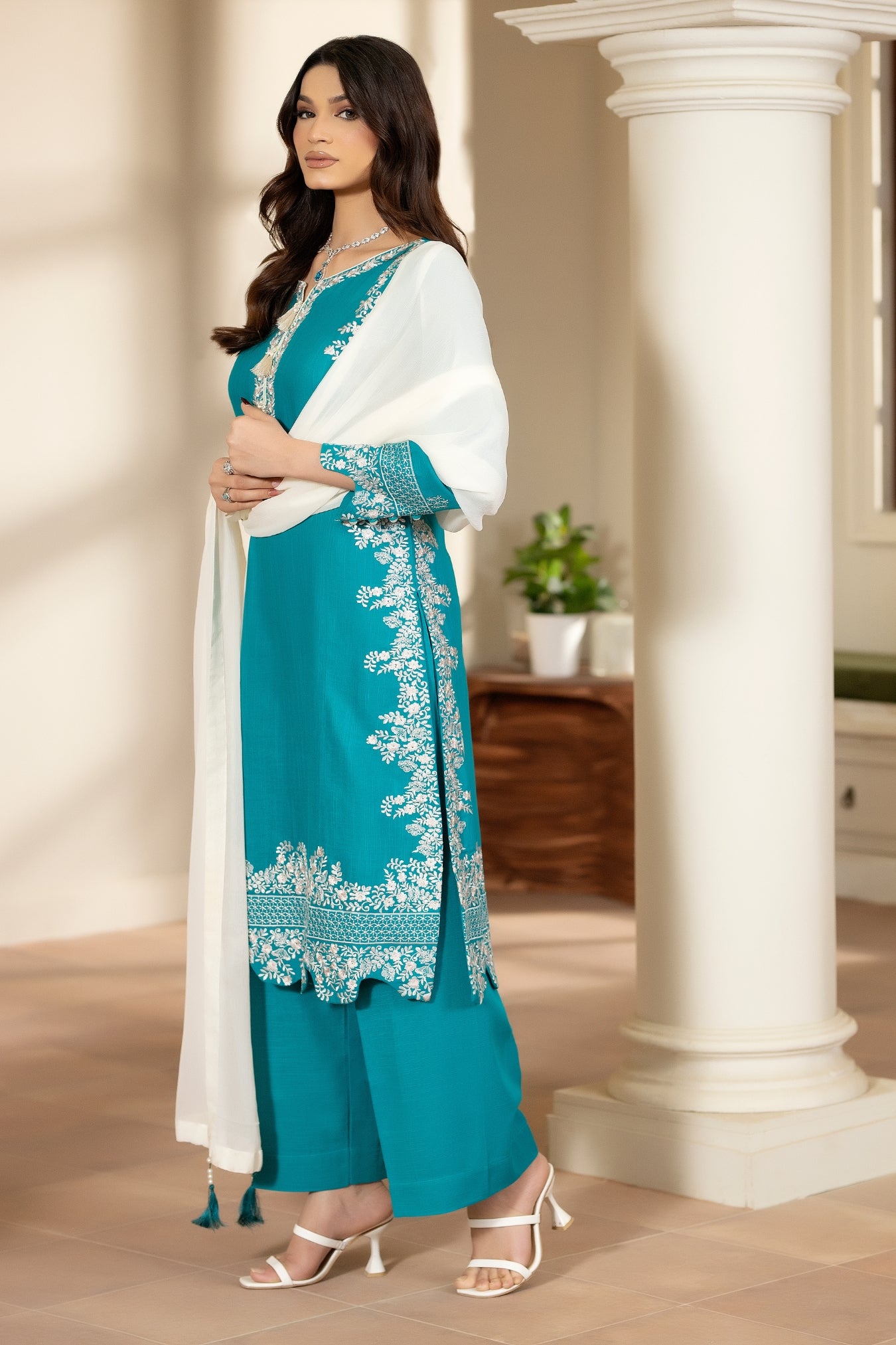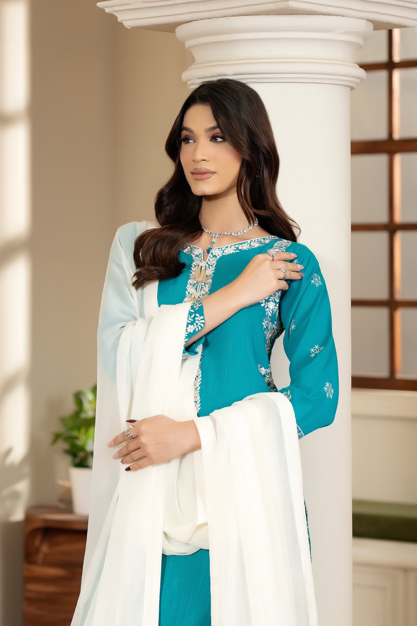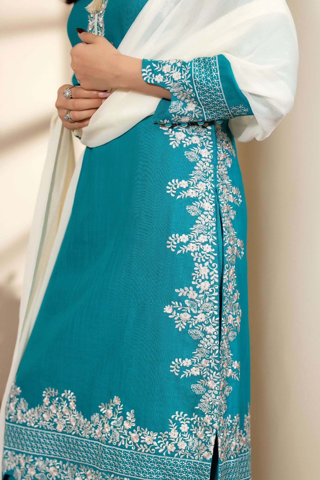 Naaz is a refined three-piece winter ensemble crafted in warm karandi, designed with elegant detailing and a timeless aesthetic. The shirt features contrast pearl-white embroidery along the front and back borders, creating a delicate yet striking finish. The V-shaped smart-cut neckline is embellished with subtle tassels and pearls, adding a graceful touch to the overall look. Embroidered sleeve borders further enhance the outfit’s refined presence.