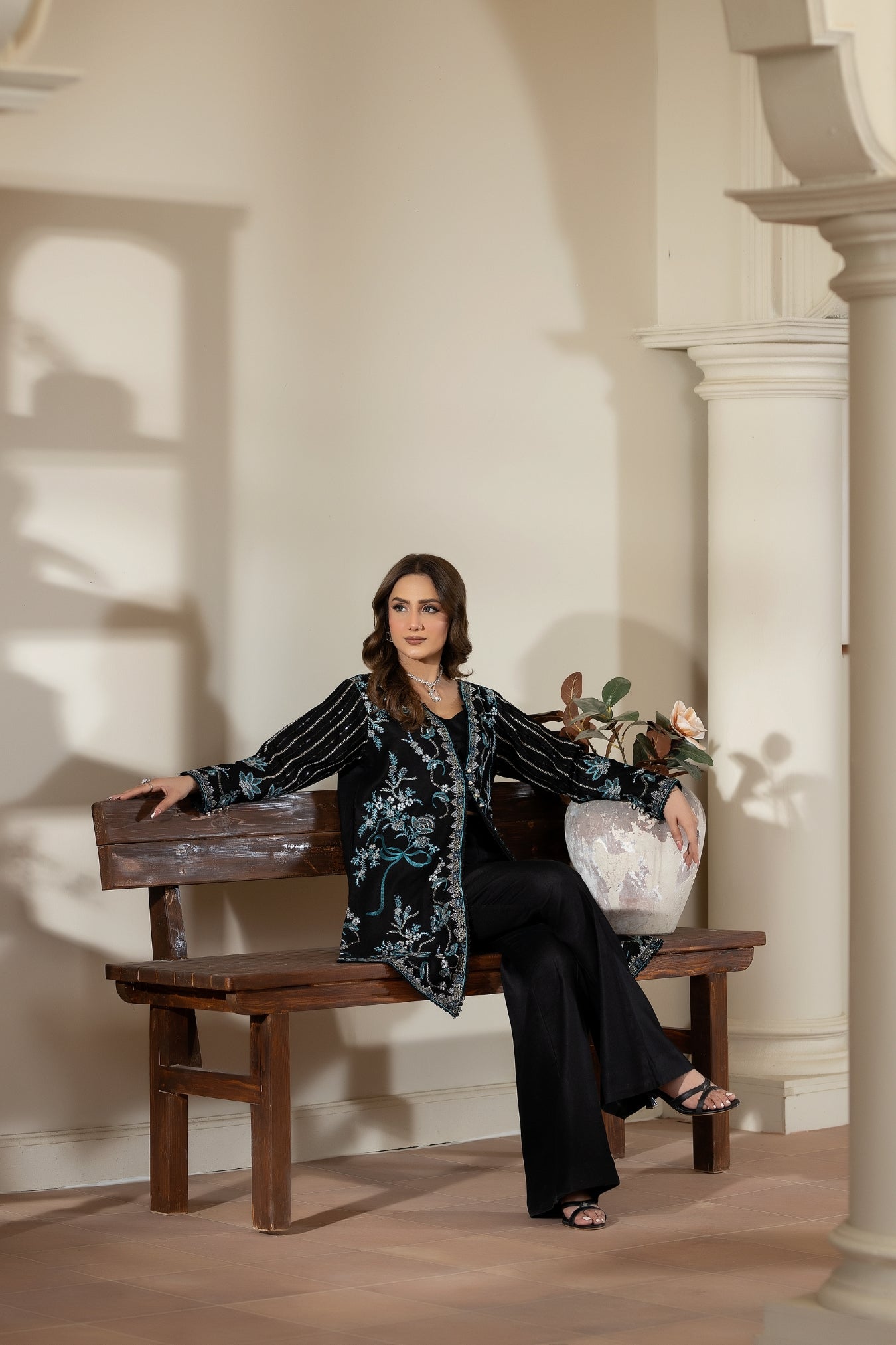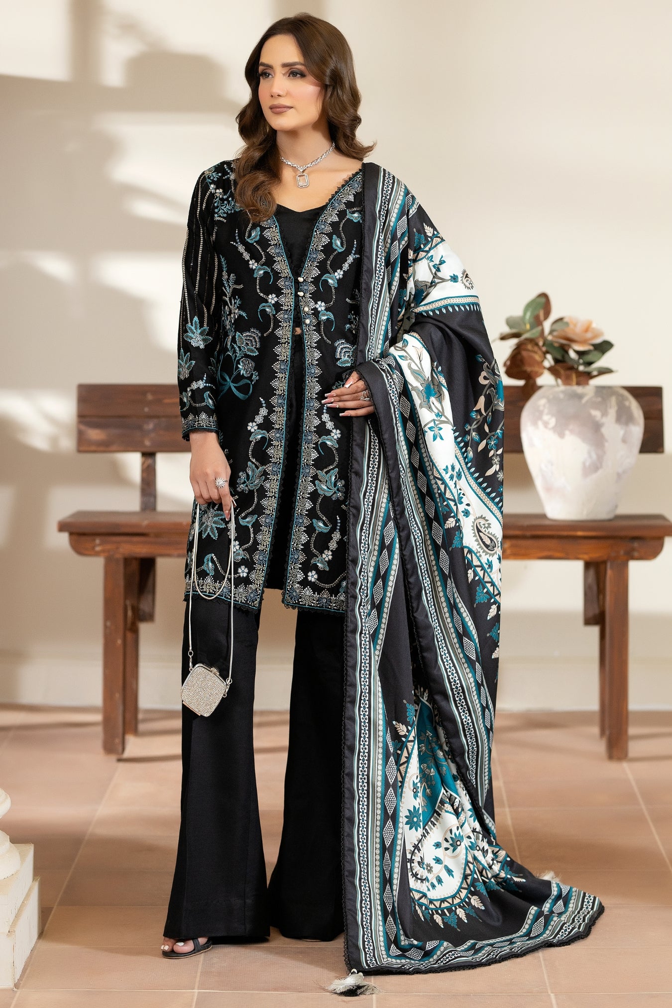 Lehaar is a refined three-piece winter ensemble designed with a balance of elegance and seasonal comfort. The outfit features a warm twill shirt paired with flared trousers, creating a graceful and well-structured silhouette. Delicate embroidery enhances the shirt, highlighting intricate patterns that elevate the overall look.